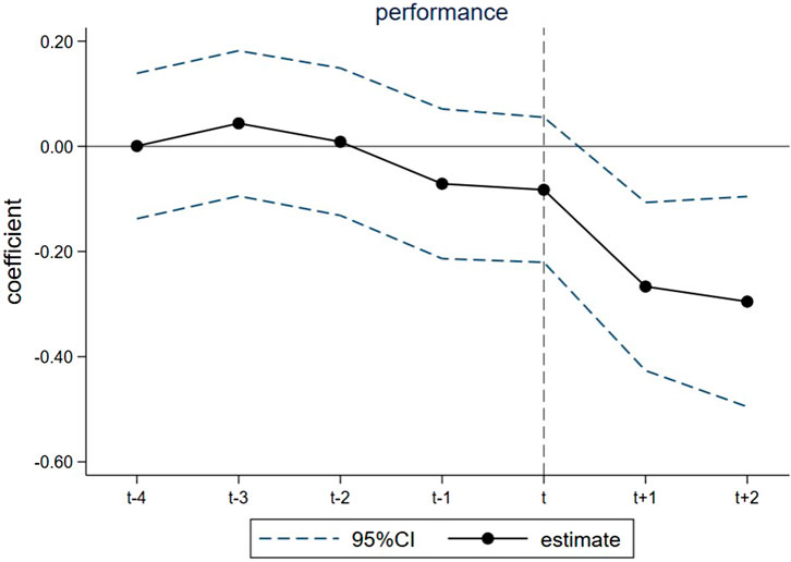 Satisfying the parallel trends assumption is a crucial prerequisite for conducting DID analysis. Figure 2 illustrates the trend of urban carbon emissions both before and after the policy’s implementation. At the policy implementation time point (t), the coefficient exhibits a significant decrease, indicating that the AI policy has an immediate and substantial impact on carbon emissions. As time progresses, the policy’s effect persists, suggesting that the AI policy has a long-term positive impact on urban carbon emissions.
