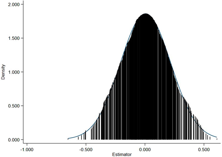 To ensure that the statistically significant results of the AI pilot policy on carbon emissions are not driven by unobserved confounding variables, this study conducted a placebo test. Specifically, a computer was used to generate new treatment groups randomly, and this process was repeated 500 times. The DID model was then applied to analyze the regression results. As shown in Figure 3, the results form a roughly normal distribution centered around zero. This indicates that, in the randomly generated treatment groups, most of the evaluation results are close to 0, showing no significant effect. Therefore, the robustness of the study’s results is confirmed.