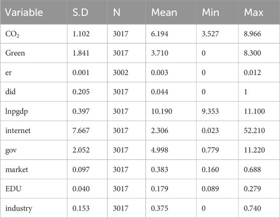 Control Variables: To better identify the impact of the AI pilot policy on urban carbon emissions, this study includes the following control variables, based on relevant literature (Ding et al., 2023): Financial support intensity (gov) is measured by the ratio of fixed asset investment to local government public budget expenditures. The industrialization level (industry) is measured by the ratio of industrial added value to local government GDP. Education Spending Level (EDU) is measured by the ratio of city educational expenditures to local government public budget expenditures. Economic Development Level (Inpgdp) is measured by the logarithm of per capita GDP. Internet Penetration Rate (internet) is measured by taking the logarithm of the number of internet users. Market potential level (market) is measured by the ratio of total social retail consumption to GDP. The descriptive statistics of these variables are presented in Table 1.