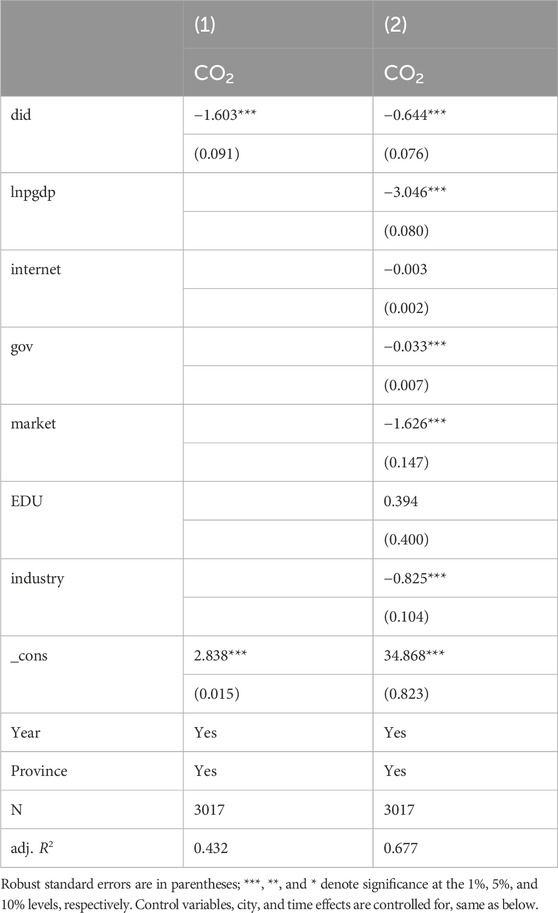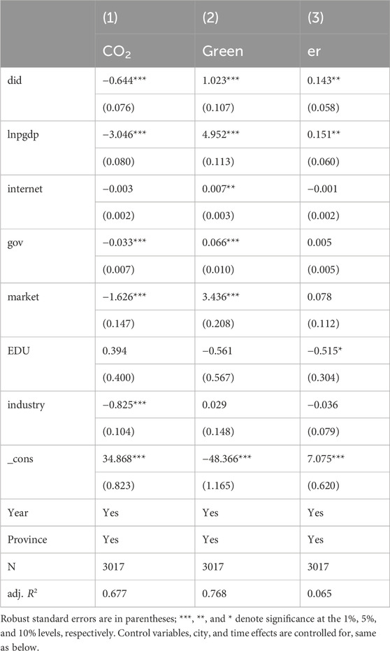 Consistent with the theoretical analysis presented earlier, the AI pilot policy is expected to have a significant impact on urban carbon emissions by promoting green technology and intensifying environmental regulations in cities.