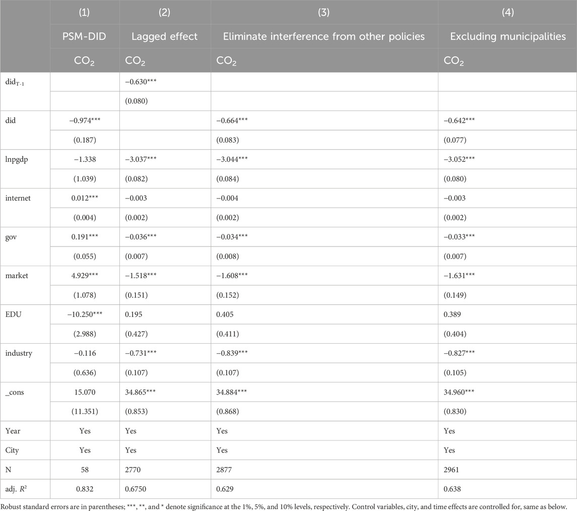 In China, municipalities hold a higher administrative status than ordinary cities. This elevated position enables them to attract more policy support, financial investment, technological resources, and talent, thereby creating advantageous conditions for the implementation of AI pilot policies. In comparison, ordinary cities often trail those directly under the Central Government in terms of technological progress and autonomy in policy implementation (Zhao and Wang, 2022). Failing to account for these differences may introduce bias into the study’s estimated results. To address this concern, the analysis excluded carbon emission data from Chinese municipalities and performed a new regression analysis. The findings indicate that AI pilot policies continue to significantly reduce urban carbon emissions at the 1% significance level. This result corroborates the robustness and reliability of the conclusion. The results are shown in column (4) of Table 4.