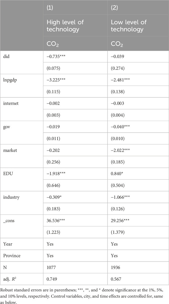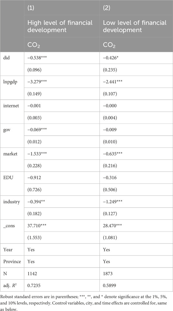 Varying levels of financial development influence the effect of AI pilot policies on curbing urban carbon emissions. The heterogeneity of urban financial development levels is examined using the amount of urban loan balances as the criterion. Financial support directly impacts the implementation of AI enterprises and technologies. Cities like Beijing and Shanghai, with their well-developed economic environments, have established AI industry development funds exceeding 1 billion yuan, creating favorable conditions for the development of AI. This financial backing not only encourages innovation but also attracts investments and talents, thereby fostering a sustainable and competitive AI ecosystem within these cities. In cities with advanced financial development, a well-established credit system supports the innovation and research of green, clean technologies and renewable resources. Financial institutions can utilize AI and digital technologies to evaluate green projects of enterprises promptly and identify the impacts of green industries (Chen and Chen, 2021). During financial investment, more emphasis is also placed on a healthy and sustainable green investment environment. To attract more financial enterprises to invest, local governments will enhance energy-saving and emission-reduction efforts, support the stable development of the carbon trading market, and thus improve the city’s green investment environment. As shown in Table 7, high levels of financial development are associated with a significant reduction in carbon emissions at the 1% significance level. However, column (2) shows that in cities with low financial development levels, the effect is weaker, occurring at the 10% significance level. This is due to limited investments and credit for green technology and renewable energy, resulting in a less pronounced suppressive effect on carbon emissions compared to cities with higher levels of financial development.