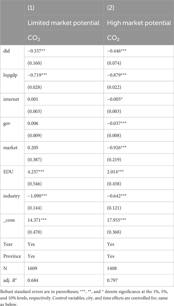 Due to differences in natural geography and historical development traditions, there is an imbalance in the level of market potential development among Chinese cities. The heterogeneity of market potential levels is determined using the marketization index as the criterion. Generally, cities in the southeastern coastal regions have higher market potential than those in the northwestern inland areas. The southeastern coastal regions are characterized by high population density, convenient water and land transportation, abundant natural geographical resources, and a long history of market-oriented traditions. In contrast, cities in the northwestern inland regions are marked by sparse populations, inconvenient transportation, and a lack of market vitality (Yan et al., 2021). Additionally, the level of market potential is closely related to city size, with megacities typically having higher market potential than medium and small cities. China classifies cities, including megacities, large cities, and huge cities, based on the number of permanent residents in urban areas as an objective criterion (Shuang and Zheng, 2024). Megacities accumulate large resident populations, and higher population density typically correlates with greater energy consumption and larger overall market demand. Consequently, megacities exhibit higher market potential. Intelligent applications such as unmanned supermarkets and robotic delivery have significantly enhanced the efficiency of market operations and consumer allocation, thereby reducing carbon emissions during the social consumption process. As shown in Table 6, in cities with low market potential, AI pilot policies suppress carbon emissions at the 5% significance level. In contrast, in cities with high market potential, the effect is more pronounced, reaching the 1% significance level.