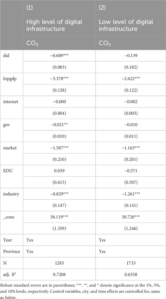 Digital infrastructure provides the necessary hardware support for implementing AI pilot policies. This study on the heterogeneity of urban digital infrastructure levels uses whether a city is a pilot city for the Broadband China and Smart City strategies as a criterion. It leverages digital technologies, such as 5G and AI, thereby aiding cities in the rational allocation of resources and enhancing energy efficiency (Hu et al., 2023). Under the strategic initiatives of Smart City, policies like the Broadband China Demonstration City and National Big Data Center Pilot Project have collectively advanced the level of digital infrastructure in Chinese cities. The integration of AI pilot policies with digital infrastructure has significantly promoted the development of urban AI + initiatives and enhanced the levels of smart city construction. This has driven the vigorous growth of the digital economy, optimized urban industrial structures, reduced the proportion of high-energy-consuming and high-polluting industries, and thus effectively lowered urban carbon emissions. Conversely, cities with weaker digital infrastructure lack the necessary hardware conditions to support the implementation of AI pilot policies, which can even be counterproductive. For instance, the implementation of AI pilot policies might increase the economic development burden of a city. The results are shown in Table 8.
