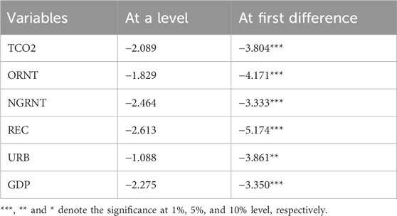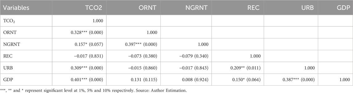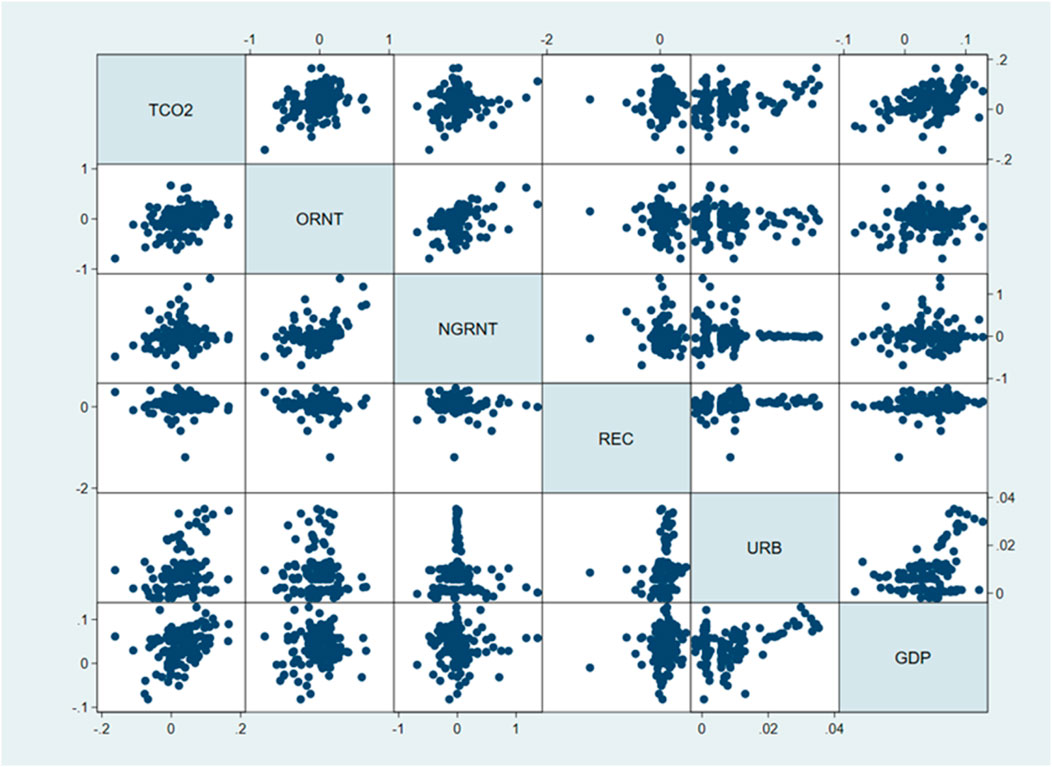 Table 3 and Figure 1 display the pairwise correlation analysis among territorial carbon emissions (TCO2), oil rent (ORNT), natural gas rent (NGRNT), Renewable electricity consumption, urbanization (URB), and GDP growth (GDP). The analysis reveals that TCO2 is positively correlated with ORNT, NGRNT, URB, and GDP growth, indicating that higher oil and natural gas rents, as well as economic growth, contribute to increased carbon emissions. In contrast, the relationship between TCO2 and REC is weak and statistically insignificant.