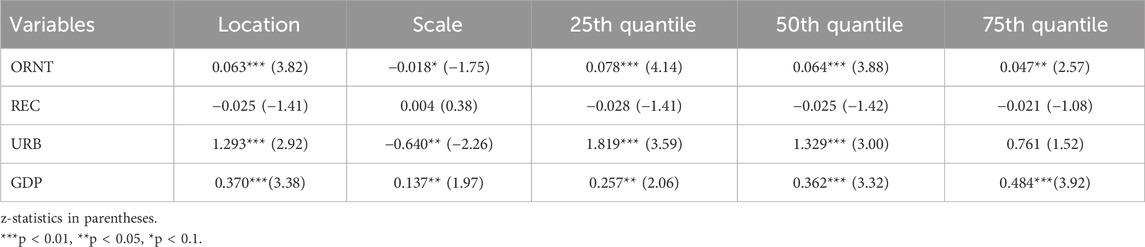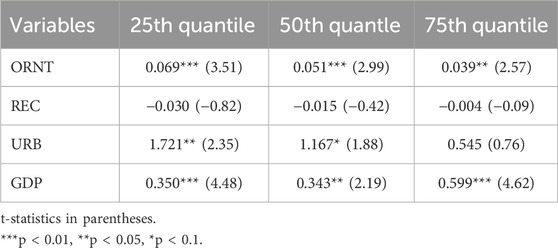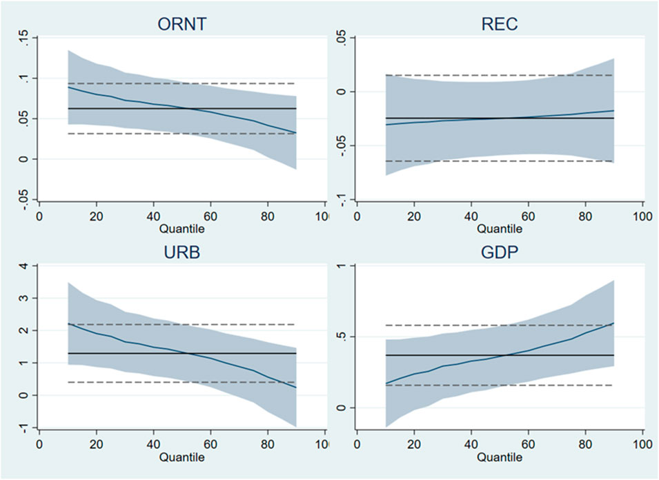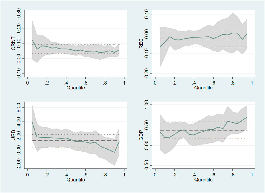At the 50th quantile, the ORNT coefficient of 0.064 demonstrates a substantial correlation between oil rents and CO2 emissions in nations exhibiting median levels of emissions. This suggests that governments in these countries are not sufficiently investing oil revenue into clean energy technologies or environmental sustainability research, reflecting the heterogeneous effects of oil rent based on economic structure, energy policies, and technological capacity. At the 75th quantile, the coefficient of 0.047 confirms that oil rent contributes positively to CO2 emissions in countries with higher emissions, further exacerbated by outdated oil extraction technologies and weak environmental regulations. These results align with recent studies (Agboola et al., 2021; Mahmood and Furqan, 2021; Mahmood and Saqib, 2022; Kahia and Omri, 2024), which underscores oil dual role as a major driver of carbon emissions and a crucial energy source. Nations with substantial oil rents generally experience higher levels of oil production and consumption, resulting in greater carbon emissions from oil-dependent activities (Huang et al., 2023).
