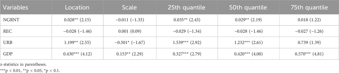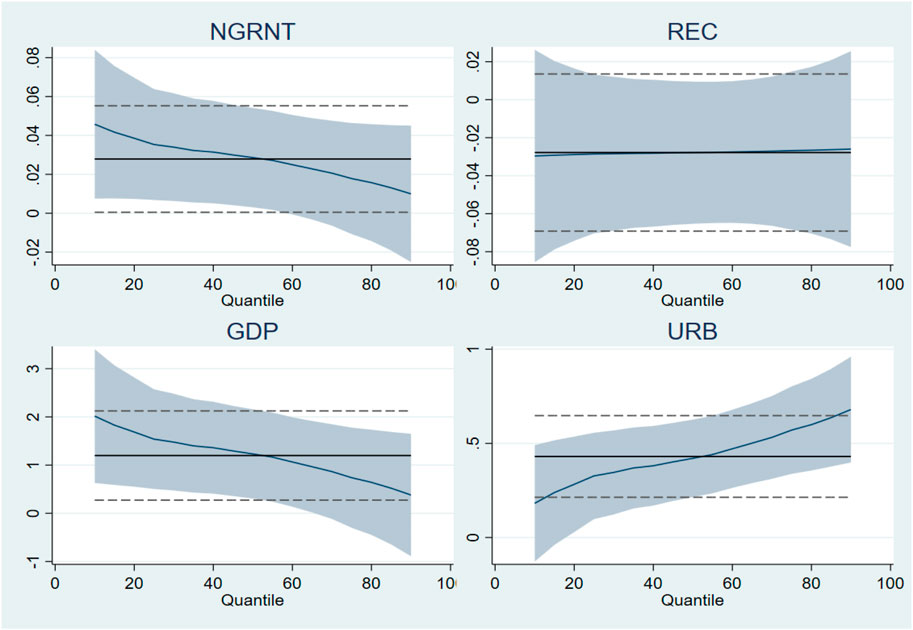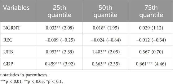 At the 75th quantile, the coefficient for NGRNT becomes −0.018 and is not statistically significant, suggesting that in high-emission countries, the effect of natural gas rent on CO2 emissions is minimal. This indicates that such countries likely mitigate emissions through the implementation of cleaner technologies, the increased use of renewable energy, and the enforcement of more stringent environmental regulations. This observation is consistent with findings from studies conducted in high-emission countries (Shahbaz et al., 2024), E7 nations (Gyamfi and Adebayo, 2023), OECD countries (Ni, 2023) and Malaysia (Ehigiamusoe et al., 2024). Therefore, it is essential to prioritize increased investment in renewable energy infrastructure alongside the advancement of carbon capture technologies to effectively mitigate emissions linked to natural gas consumption. Additionally, policies that allocate natural gas rent towards cleaner technologies and energy-efficient systems can contribute to reducing the carbon intensity of natural gas usage.