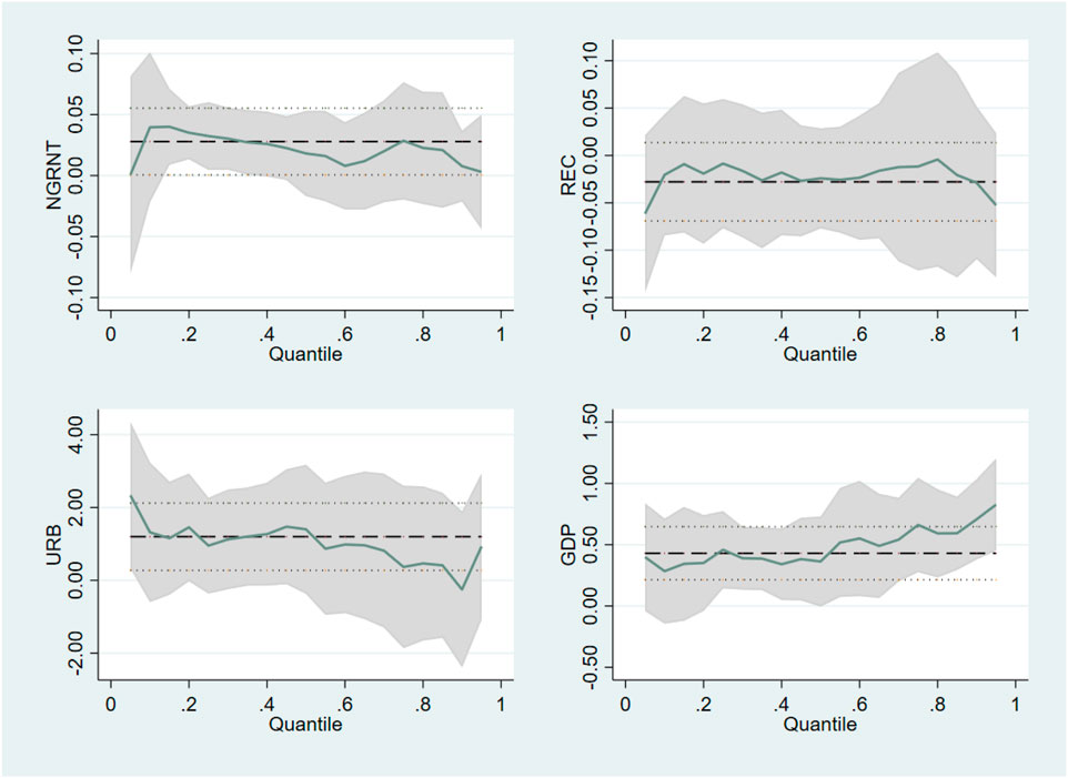 The results of the Method of Moments Quantile Regression (MMQR) for Model 2 are shown in Table 10 and Figure 3. This analysis explores the influence of natural gas rent (NGRNT) on CO2 emissions among the member countries of the Shanghai Cooperation Organization (SCO). The relationship between NGRNT and CO2 emissions differs across various quantiles of emissions. Specifically, at the 25th and 50th quantiles, the coefficients for NGRNT are 0.035 and 0.29, respectively, both of which are statistically significant at the 5% level. These findings suggest that in countries with lower and median emissions, higher natural gas rent does not lead to sufficient investment in clean energy or environmental protection initiatives. Despite natural gas being a cleaner alternative to coal, its extraction and consumption still contribute to emissions in these nations. Extraction practices often lack environmental safeguards, exacerbating degradation, while reliance on fossil fuels, including natural gas, due to underdeveloped renewable energy infrastructure, increases emissions (Zhang and Li, 2023; Shahbaz et al., 2024) its extraction and consumption still contribute to emissions in these nations. This is especially relevant for SCO countries that rely on natural gas for energy production, where extraction practices often fail to meet environmental protection standards, thus exacerbating environmental degradation. The utilization of pollution-intensive and energy-inefficient methods for extracting natural gas contributes to higher carbon dioxide emissions (Ehigiamusoe et al., 2024). Additionally, the insufficient development of renewable energy infrastructure in some of these lower-emission countries may lead to greater reliance on fossil fuels like natural gas, further intensifying emissions.