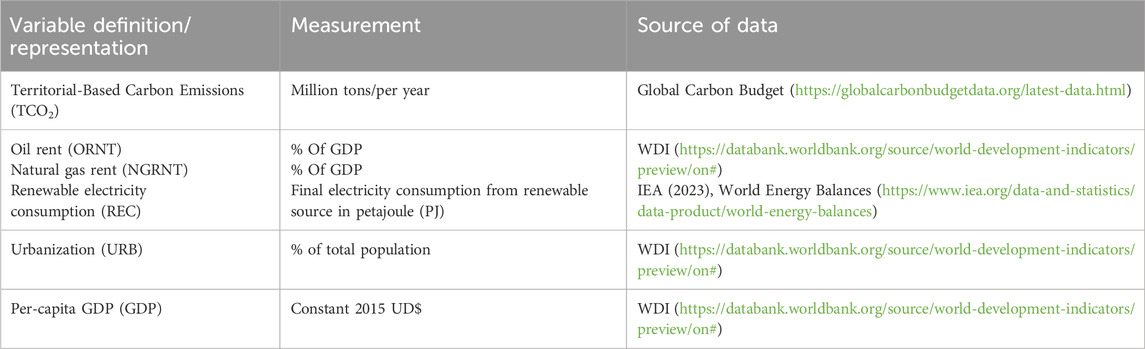 This research examines how distinct natural resource rents particularly from oil and gas affect carbon emissions in Shanghai Cooperation Organization (SCO) member states. The SCO, a prominent regional alliance, includes nine nations: China, Russia, Kazakhstan, India, Pakistan, Iran, Uzbekistan, Kyrgyzstan, and Tajikistan. However, this study excludes Kyrgyzstan and Tajikistan due to missing data for these countries. The analysis spans 2000–2021, assessing the environmental impact of resource-derived revenues. The study uses five key variables, with Territorial-Based Carbon Emissions (TCO2) as the dependent variable, as CO2 is the primary greenhouse gas driving environmental degradation. TCO2 reflects emissions within a given territory, including exports but excluding imports, thereby attributing emissions to the producer. The data for TCO2 is taken from the global carbon budget. This measure is essential for assessing regional contributions to global climate change and devising targeted mitigation strategies. Natural resource rents, particularly oil and natural gas rents, are significant contributors to TCO2, impacting national economies and environmental outcomes, especially in resource-dependent regions. To account for potential omitted variable bias, additional control variables, including renewable electricity consumption (REC), urbanization (URB), and per capita GDP growth, were incorporated. This study utilizes World Development Indicators (WDI) data for oil and gas rents, urbanization, and GDP, supplemented by renewable electricity consumption statistics from the International Energy Agency (IEA). TCO2 emissions figures were sourced from the Global Carbon Budget. Logarithmic transformations were applied to all variables. Complete data specifications are provided in Table 1.