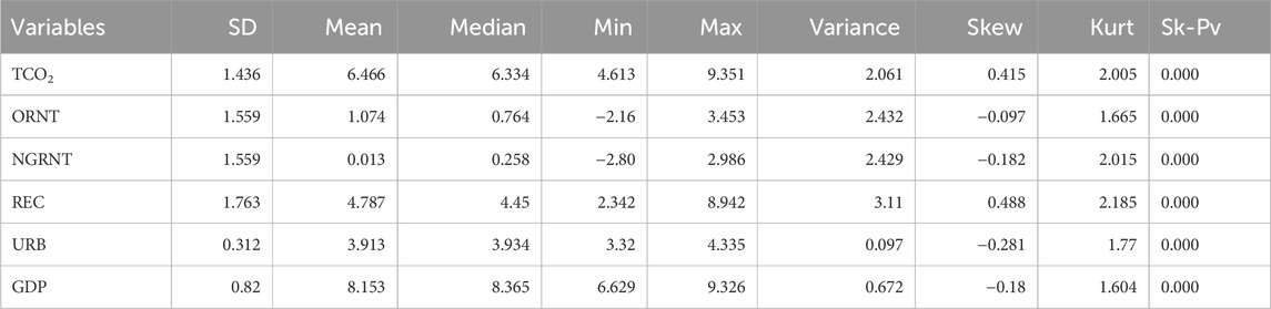 Table 2 presents the descriptive statistics, highlighting significant variability across the examined variables. The mean, median, and range values emphasize this heterogeneity, with some variables deviating notably from normality. For instance, TCO2 shows a positive skew (0.415) and high kurtosis (2.005), indicating a slight rightward asymmetry and heavy tails in its distribution. Its variance of 2.061 further supports this dispersion. In contrast, ORNT and NGRNT exhibit negative skewness (−0.097 and −0.182, respectively), with moderate kurtosis values (1.665 and 2.015), suggesting left-skewed distributions and potential outliers. The REC variable also shows a positive skew (0.488) and high variance (3.11), indicating an asymmetric distribution with a tendency towards higher values. URB displays minimal variance (0.097) and slight leftward skew (−0.281), while GDP has moderate variability and negative skew (−0.18). Given these distributional complexities, the Method of Moments Quantile Regression (MMQR) is employed to capture conditional heterogeneity, offering deeper insights into non-linear relationships across emission quantiles.
