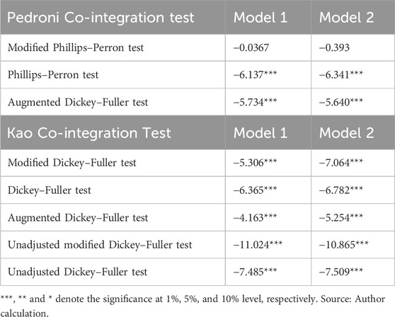 After assessing unit root properties, cointegration analysis is conducted to evaluate long-run equilibrium relationships among variables. Panel cointegration tests primarily adopt two methodologies: residual-based and maximum-likelihood-based techniques. Kao (1999), residual-based approach, extended by Pedroni, applies Dickey-Fuller (DF) and Augmented Dickey-Fuller (ADF) frameworks. The Kao test assumes no cointegration under the null hypothesis, with significant ADF statistics leading to its rejection, thus confirming cointegration. This approach provides enhanced flexibility by permitting varying constants and trend coefficients across cross-sectional units. The (Pedroni, 1999; Pedroni, 2004) methodology first estimates residuals from the cointegrating equation, accounting for spatial dependence while accommodating heterogeneous intercepts and slope parameters. Such panel cointegration tests effectively assess long-run equilibrium relationships by testing the null of no cointegration against its alternative.
