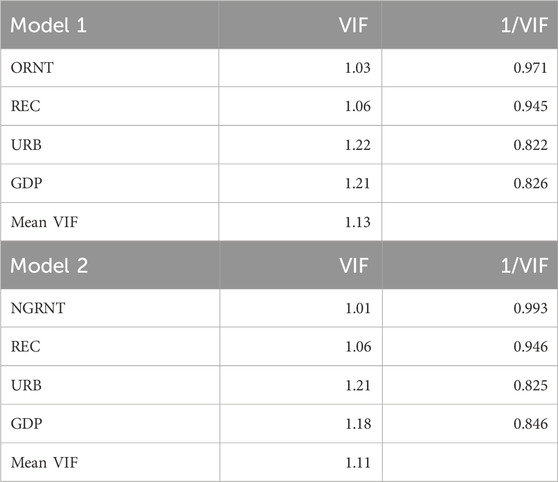 Prior to analyzing MMQR regression results, it is crucial to assess multicollinearity among independent variables (Sultana et al., 2023). Multicollinearity arises when independent variables are highly correlated, obscuring their distinct effects on the dependent variable. The Variance Inflation Factor (VIF) quantifies this issue by measuring how much multicollinearity increases coefficient variance in regression analysis. A VIF above 10 signals significant correlation, undermining coefficient reliability (Alofaysan et al., 2024). A VIF between 5 and 10 suggests moderate correlation, while a VIF above 10 implies poor coefficient estimation due to multicollinearity (Saidi et al., 2023).