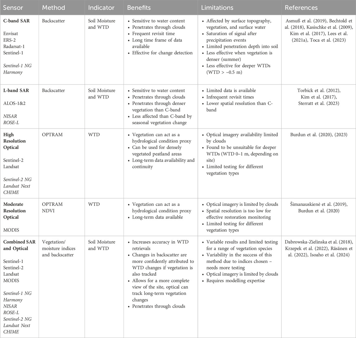 While the Code provides a credible foundation for validating carbon credits, the current monitoring approach detailed by the IUCN’s Field Protocol (IUCN, 2017) exhibits significant limitations. Primarily based on manual field surveys, it is resource-intensive and limits spatial and temporal data collection. Additionally, broad condition categories may fail to capture the nuanced progress of peatland recovery. A robust monitoring framework must be established to continually evaluate the impact of restoration activities and underpin carbon credits, also allowing for accurate reporting of greenhouse gas (GHG) sources and sinks. To be effective, such a framework would need to rely on systematic, long-term measurements of key peatland condition indicators. Remote sensing satellites provide substantial advantages over traditional monitoring methods, offering wide coverage of remote and inaccessible areas, delivering consistent and objective data over time, enabling timely detection of changes in peatland condition, and doing so in a cost-effective manner–thereby improving monitoring efficiency and supporting adaptive management. Because of this, there is a growing trend of using remote sensing satellites to monitor aspects of peatland condition (Guo et al., 2017; Czapiewski and Szumińska, 2021), which will only accelerate with continuing advances in satellite data availability and technology. This paper identifies a set of key indicators of peatland condition that are relevant for such a monitoring framework and presents a comprehensive review and synthesis of the feasibility of currently available open-access remote sensing satellites to measure and monitor these indicators operationally.