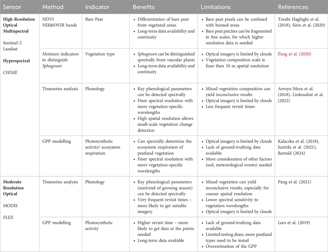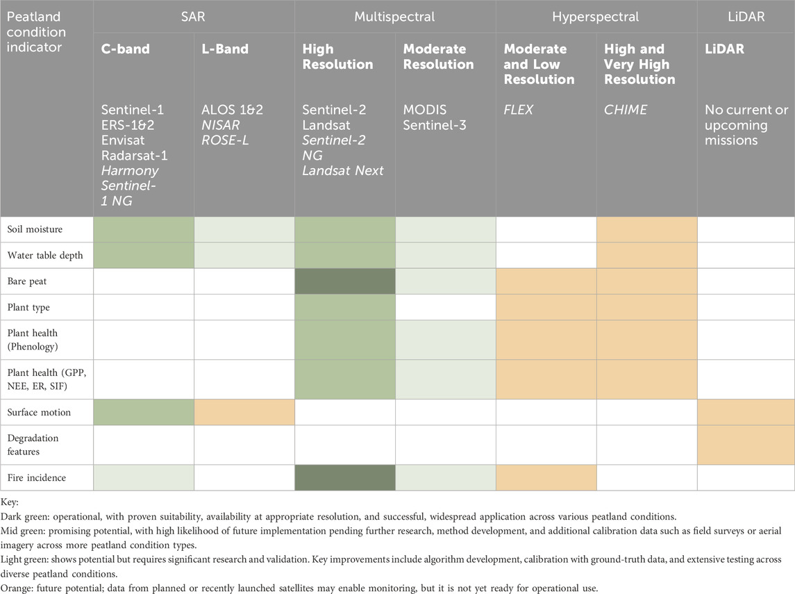 Table 4. Matrix summarizing remote sensing satellite data suitability to monitor each peatland condition indicator based on the literature review, future satellites are shown in Italics.
