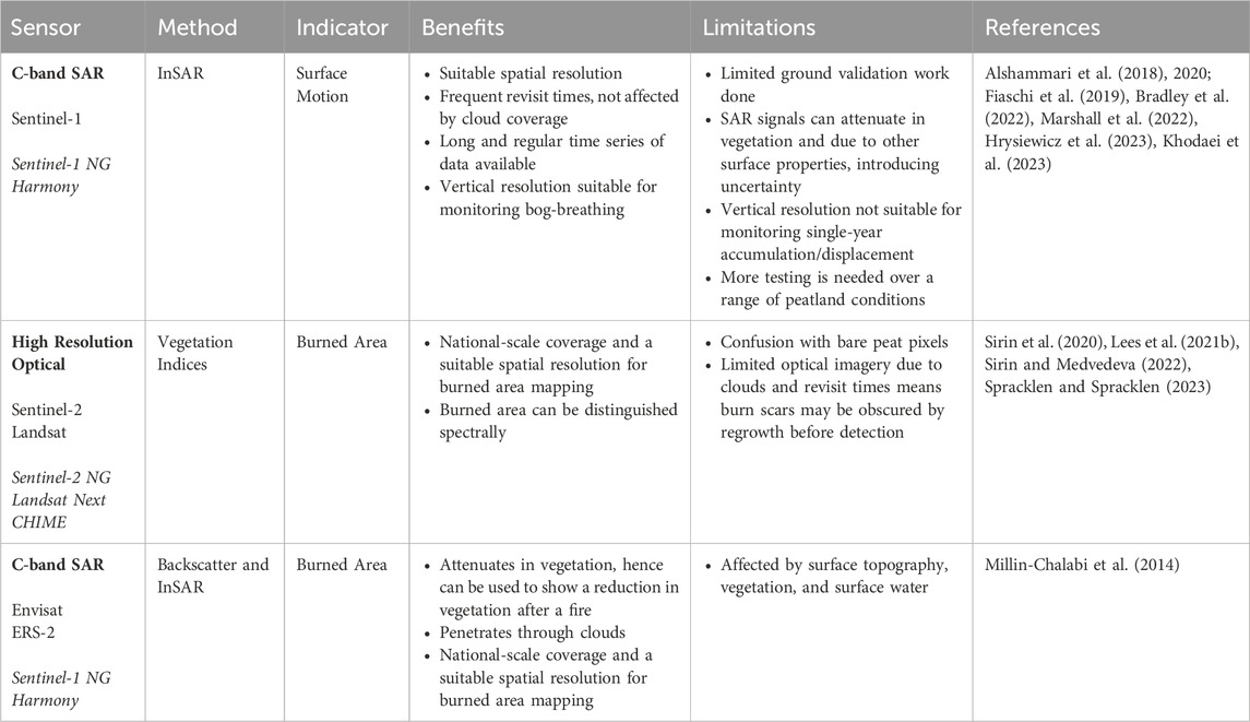 A summary of satellite-based methods for monitoring fire incidents is presented in Table 3. Four of the studies reviewed make use of vegetation indices derived from optical imagery to detect burned areas of peatland. Sentinel-2 (10 m) and Landsat 5/7/8 (30 m) imagery have been utilized to both detect burned area and monitor vegetation recovery. However, the lack of cloud-free imagery around the burn season (October to April) resulted in known burn patches not being captured. A further challenge is the inability to discriminate spectrally between bare peat and burned area. To overcome this limitation Sirin and Medvedeva, (2022) used hotspot data retrieved from MODIS imagery to improve the classification of burned peatlands but found that, due to low intensity of radiance emitted by peatland fires and frequent cloud coverage, hotspot datasets are characterized by omission errors. Millin-Chalabi et al. (2014) investigated the potential of SAR intensity and InSAR coherence to detect peatland fire scars, and while they outlined that this approach would need further work to disentangle the effects of fire size, topography, and less generalized land-cover classes on SAR intensity and InSAR coherence, they showed good initial results of SAR intensity detecting burned peat. One of the most important things to note from the use of SAR data to detect fire scars is the potential for this method to be combined with optical methods to distinguish between bare and burned peat areas.