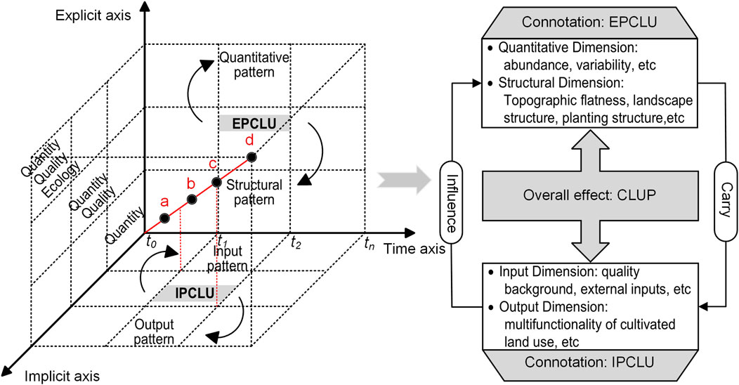 In view of this, referring to the approach of previous scholars in characterizing land use patterns through three-dimensional space (Niu et al., 2020; Zhou and Long, 2023), this paper constructs a “time-EPCLU-IPCLU” three-dimensional evolution model of CLUP from the perspective of spatiotemporal transformation (Figure 1). In terms of the time dimension, the evolution trajectory is recorded by the time sequence axis (t0→tn), and the turning points of EPCLU and IPCLU mark the stage jumps of CLUP. In the pattern dimension, the explicit axis characterizes the evolution of the background properties of “quantity-structure”, while the implicit axis reflects the internal functional response of “input-output”. Ultimately, the evolution of CLUP essentially follows a three-stage progression (Zou et al., 2025), developing from the scale expansion in the initial “quantity” dominant stage to the functional optimization in the middle “quantity-quality” collaborative stage, and further to the systematic coordination in the final “quantity-quality-ecology” trinity stage, achieving the leap from point a to point d. This evolutionary trend profoundly reflects the upgrading path of the cultivated land use system from a low-level equilibrium dependent on the natural background to a high-level coordinated state of human-land harmony, serving as a dynamic interpretation of the theory of regional systems of human-land relations in the field of cultivated land use.