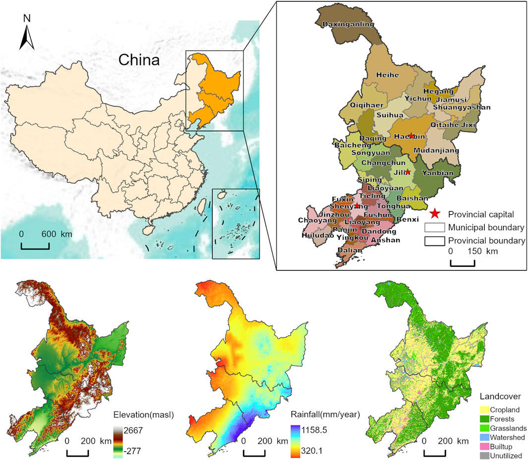 Given data availability, the Northeast China region studied in this paper primarily covers three provinces: Heilongjiang, Jilin, and Liaoning (Figure 2), with municipal-scale units as the research scope. The study area is located at higher latitudes, characterized by a temperate humid and semi-humid monsoon climate with moderate annual precipitation and suitable sunlight. Crop rotation systems are mostly single-cropping per year, dominated by staple food crops such as maize, soybean, and rice. The region features flat terrain with extensive plains, fertile black soil high in organic matter content, and unique conditions for agricultural production. Cultivated land accounts for approximately 1/5 of China’s total arable land, producing 1/3 of national grain output and 1/4 of commercial grain exports. Agriculture is undergoing a critical transition from high-growth to high-quality development, serving as the “ballast stone” and “voltage stabilizer” for ensuring national food security (Zhang et al., 2023).