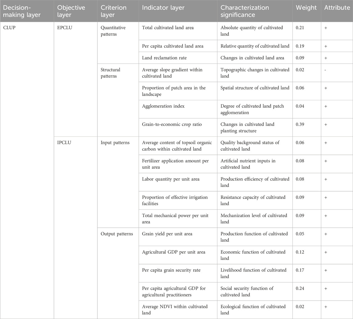 Based on the conceptual connotations of the above “EPCLU-IPCLU” (Figure 1), referring to existing studies (Wang and Yu, 2023; Zhou Y. et al., 2024; Li and Yang, 2024), integrating the regional demands for black soil protection and food security in Northeast China, and considering the availability of multi-source data, an evaluation index system for CLUP covering EPCLU and IPCLU was constructed (Table 1) to achieve a quantitative analysis of the collaborative mechanism of EPCLU and IPCLU. Among them, EPCLU is characterized by two dimensions of quantity and structure to reflect the specific spatial conditions of the cultivated land use system. IPCLU is characterized by input and output dimensions, to reflect the external influences exerted by the external environment and human activities on the cultivated land use system. At the quantitative level, the total cultivated land area, per capita cultivated land area, and land reclamation rate are selected to reflect the abundance of cultivated land quantity. At the structural level, the average slope gradient within cultivated land, the proportion of patch area in the landscape, the aggregation index, and the grain-to-economic crop ratio are selected to reflect the spatial structure, landscape structure, and planting structure of cultivated land. At the input level, the average content of topsoil organic carbon within cultivated land, the fertilizer application amount per unit area, the labor quantity per unit area, the proportion of effective irrigation facilities, and the total mechanical power per unit area are selected to reflect the nutrient background of cultivated land and the quantity and structure of production factors invested by cultivated land users. At the output level, the grain yield per unit area, agricultural GDP per unit area, per capita grain security rate, per capita agricultural GDP of agricultural practitioners, and the average NDVI (Normalized Difference Vegetation Index) within cultivated land are selected to reflect the beneficial attributes, the quantity of benefits, and the structure of benefits that are conducive to social development resulting from the interaction between cultivated land and external environment (Zhou G. et al., 2024).
