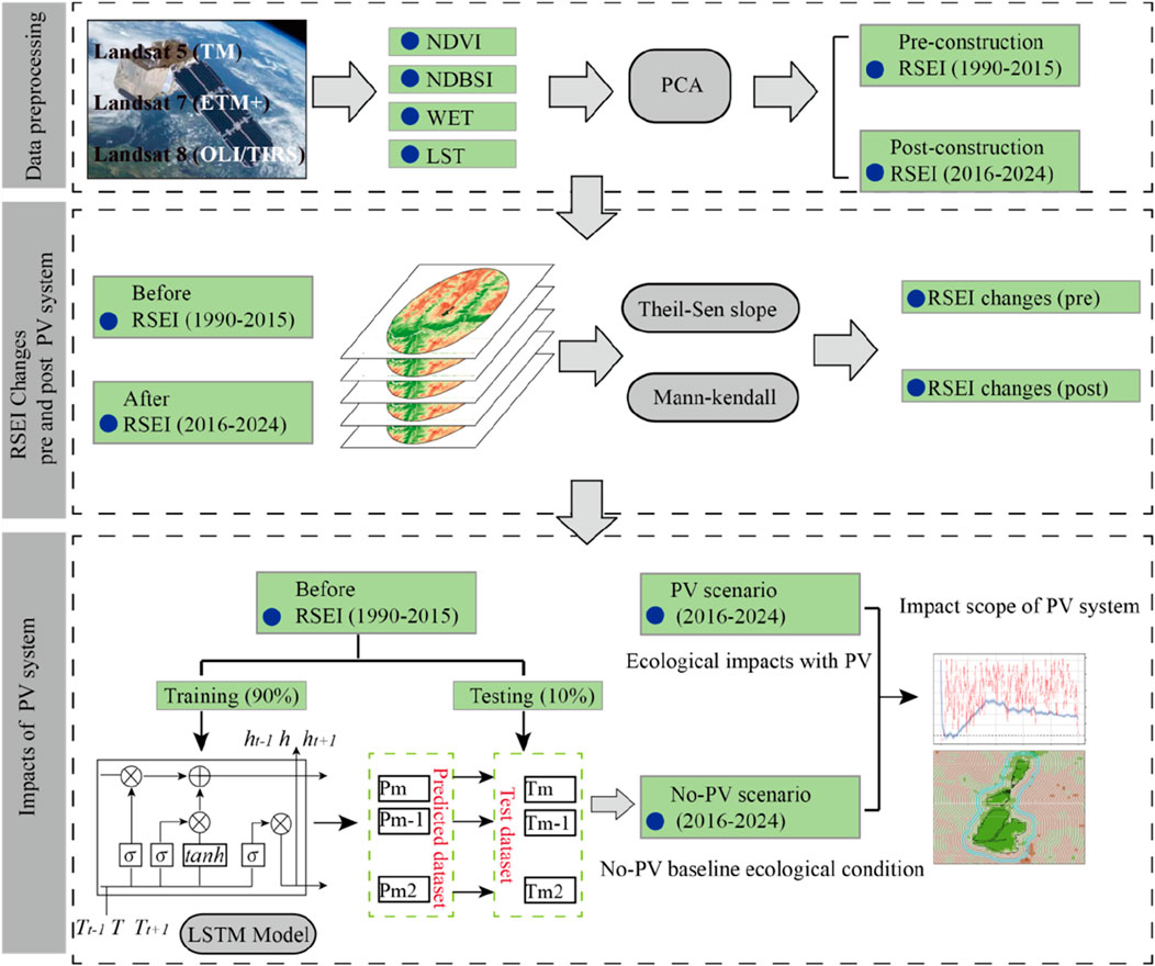 3. Scenario Comparison: Historical RSEI data from 1990 to 2015 (unaffected by PV system) were used to train a Long Short-Term Memory (LSTM) network. The model simulated natural-state RSEI trajectories in 2016–2024 without PV impact. Observed RSEI values were compared against LSTM predictions to quantify the ecological changes caused by PV system.