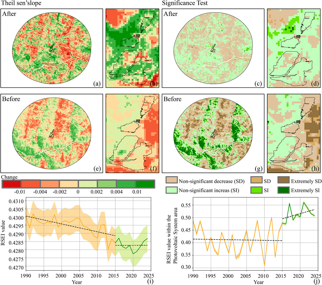 Post-construction, the regional balance shifted: declining RSEI pixels fell to 48.3%, while rising pixels increased to 51.7%. Notably, within the panel zones, 77.6% of pixels exhibited significant increasing trends and only 22.4% showed declines, demonstrating a marked ecological enhancement attributable to the PV system.