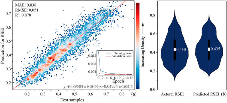 To comprehensively evaluate the performance of the LSTM model’s performance in predicting RSEI, this study conducted simulation experiments using 50,000 samples from the 1990–2015 period. Among these, 45,000 samples were used for model training, and the remaining 5,000 samples were utilized to test the model’s predictive capability. Simulation results demonstrated a mean absolute error (MAE) of 0.038, indicating an average deviation between predicted and observed RSEI values. The root mean square error (RMSE) of 0.051 further confirmed the concentration of error distribution. A coefficient of determination (R2) of 0.878 revealed that the model effectively explained the data variability, highlighting its superior nonlinear fitting capacity. From the loss curve, it can be observed that the model fits well, with training and validation losses converging stably without significant overfitting (Figure 4). These robust performance metrics underscore the exceptional robustness of the LSTM model.