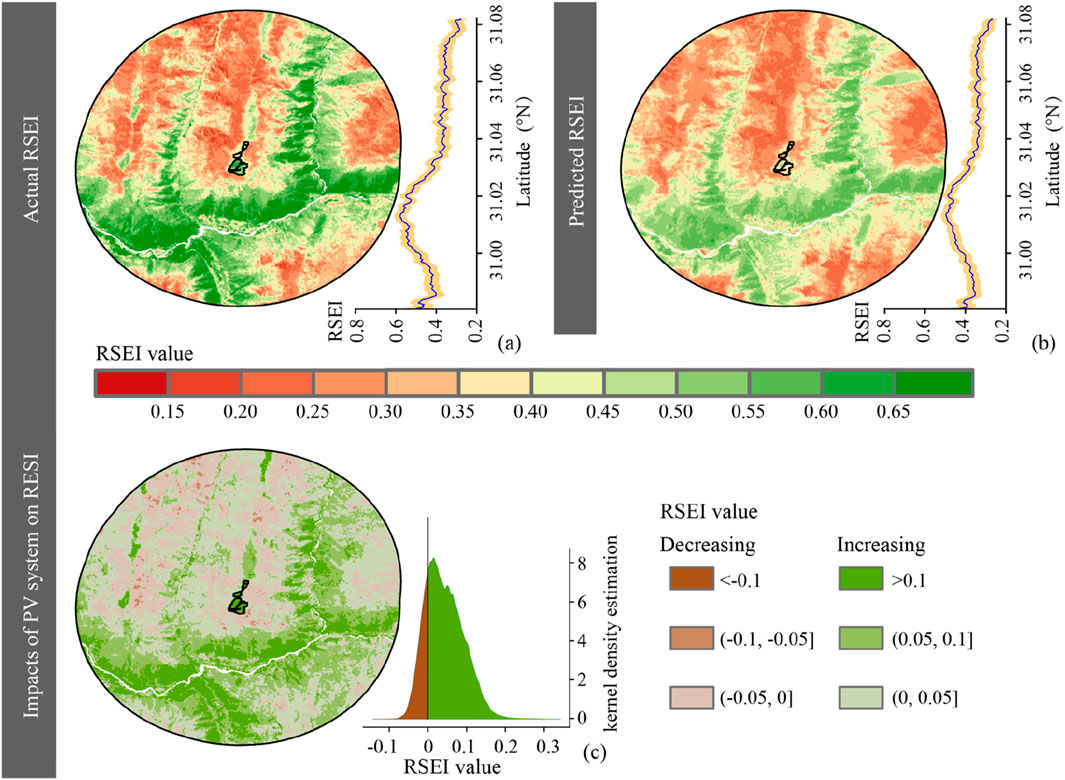 Figure 5 contrasts the observed post-construction RSEI distribution with a counterfactual simulation in which the PV system was never installed. As shown in Figure 5a, after construction, RSEI exhibits a clear south-to-north gradient, with the highest values (RSEI >0.60) concentrated along river corridors, valley floors and beneath PV panels (mean = 0.52). In the no-PV simulation (Figure 5b), the same south-high-north-low pattern is evident, but mean RSEI in the PV system is markedly lower (mean = 0.38). This divergence indicates a net ecological benefit attributable to the PV system.