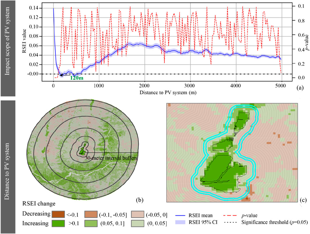 Moreover, the ecological benefit attenuated exponentially with distance from the PV system. RSEI increments declined by 50% within 30 m (0.07), reached 0.02 at 60 m, and became negligible (0.005) at 120 m (Figures 6b,c). T-test analyses confirmed significance (p < 0.05) out to 120 m; beyond this radius the effect gradually weakened and effectively disappearing after 720 m.