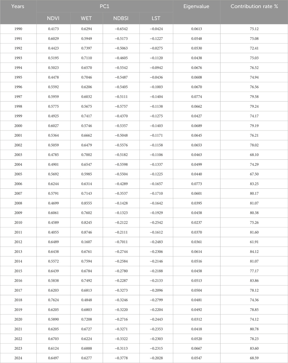 The principal component analysis based on the four indicators (Table 1), showed that the first principal component (PC1) accounted for an average of 76.8% of the total variance across the 35-year period, indicating that PC1 captures the majority of the characteristics represented by the four indicators and can effectively reflect the ecological conditions of the study area. NDVI and WET showed high average correlation coefficients with positive loadings, suggesting their positive contributions to ecological quality. In contrast, NDBSI and LST exhibited negative loadings, reflecting their adverse effects on ecological quality assessment, which aligns with the actual conditions observed in the study area.