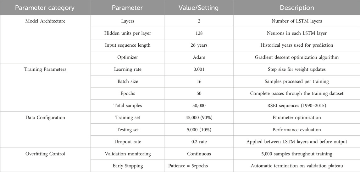LSTM is a specialized deep learning model designed for processing long-term sequential data, capable of capturing nonlinear features in time series while avoiding the vanishing and exploding gradient problems common in traditional Recurrent Neural Networks (RNNs) (Gers et al., 2000). This study developed a two-layer LSTM model architecture. The output from the first LSTM layer serves as direct input to the second layer, enhancing the model’s capacity to model complex temporal patterns (Wang et al., 2018). The model consists of two hidden layers with 128 hidden units each. The input sequence length was set to 26 years to predict the RSEI value for the subsequent year. Model training was performed using the Adam optimizer with a learning rate of 0.001 over 50 epochs and a batch size of 16. To mitigate overfitting, the training set was randomly reshuffled each epoch, and model performance was monitored on a held-out validation set. Additionally, we implemented dropout regularization (rate = 0.2) within the LSTM architecture and employed early stopping with a patience of 5 epochs, automatically terminating training when validation performance ceased to improve to ensure optimal generalization capability.