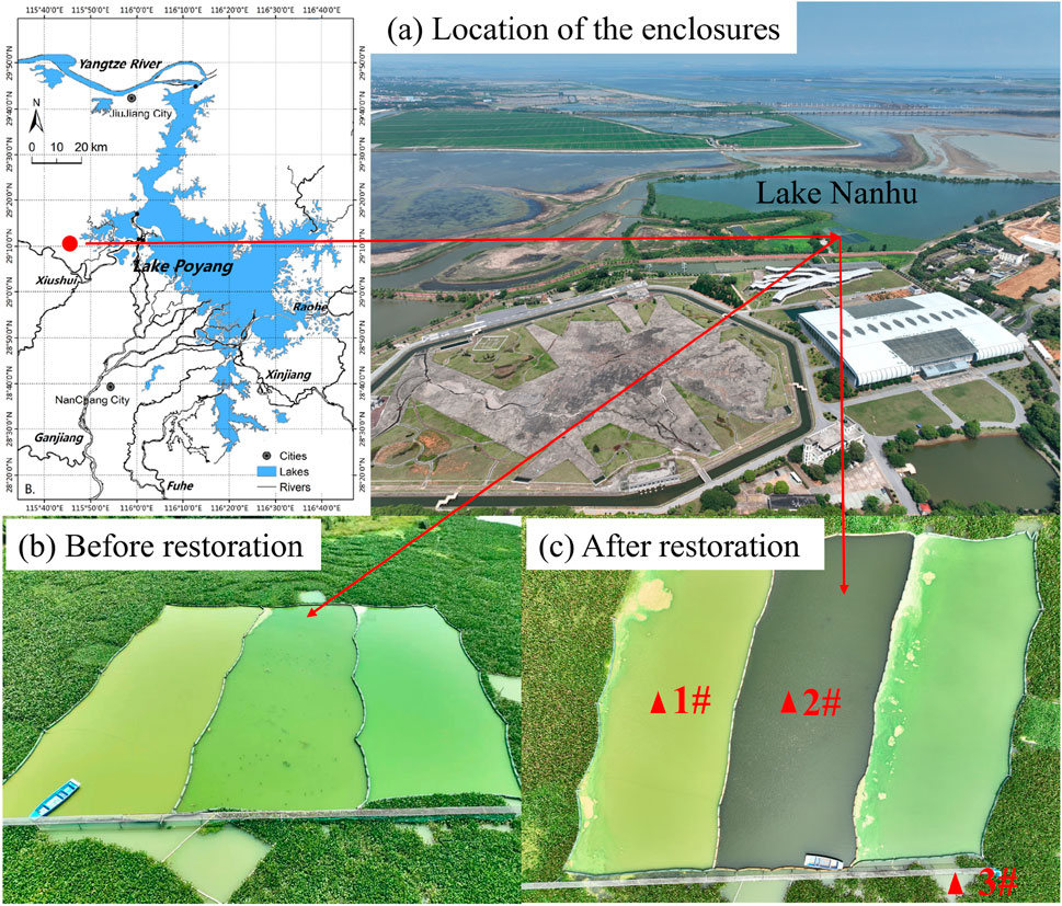 Figure 1. Location of the study area (solid red dot) and sediment sampling sites (solid red triangle). (a) Location of the enclosures. (b) Before restoration. (c) After restoration.