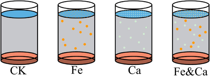 Figure 2. Different treatment groups for the two sediments. Each treatment had three replicate units. CK: sediment control group without treatment; Fe: sediment treated with ferric salt (FeCl3); Ca: sediment treated with calcium salt (Ca(OH)2); Fe&Ca: sediment treated with combined ferric and calcium salts.