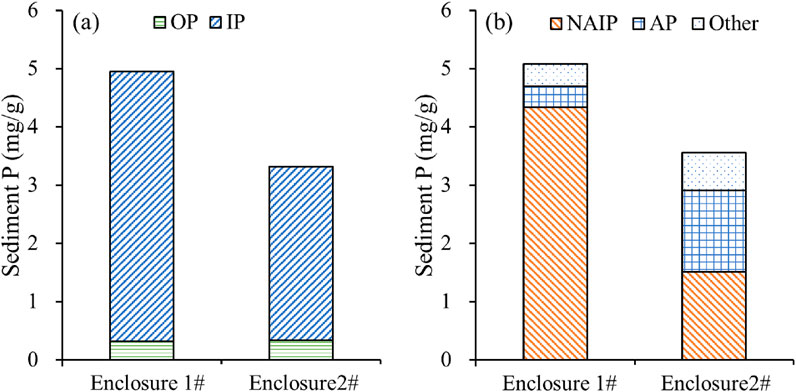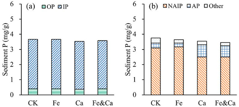 Figure 5. Sediment P fractions in the sediment incubation experiment. (a) OP and IP; (b) NAIP and AP. “Other” refers to P fractions other than NAIP and AP, includes residual organic phosphorus and other non-extractable phosphorus forms not classified as NAIP or AP.