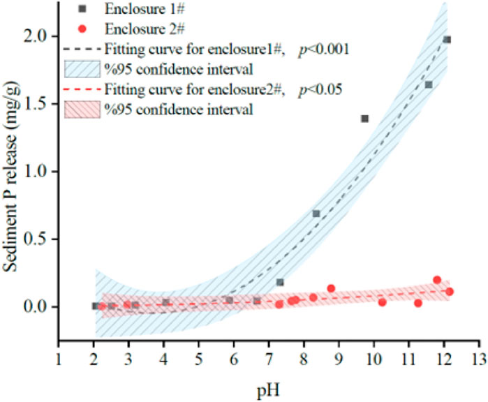 Under acidic conditions, the P release of both sediments was minimal and exhibited a negative correlation with increasing acidity. With the increase in alkalinity, there was a significant enhancement in P release from sediments within enclosure 1#, reaching a maximum of 1.98 mg/g. In contrast, the P release trend within enclosure 2# was less pronounced and relatively slow, with a maximum release of only 0.20 mg/g, 5.7% of that observed in enclosure 1# (Figure 4).