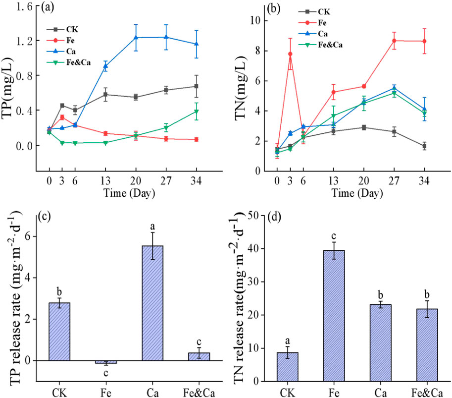 The increased nitrogen release in Fe, Ca, and Fe&Ca treatments may be due to several factors: (1) Fe addition could inhibit nitrification and promote dissimilatory nitrate reduction, leading to ammonium accumulation; (2) high pH from Ca(OH)2 may enhance organic nitrogen mineralization; (3) chemical treatments might disrupt sediment structure, releasing previously immobilized nitrogen. Although nitrogen release increased temporarily, the significant reduction in phosphorus release—the primary limiting nutrient in eutrophic lakes—likely outweighs this effect. These changes highlight the need to consider nitrogen dynamics when applying P immobilization agents, as unintended nitrogen release could offset eutrophication control efforts. Further studies should monitor long-term nitrogen dynamics and include nitrogen (e.g., NH4+, NO3−) speciation analysis to assess ecological trade-offs.