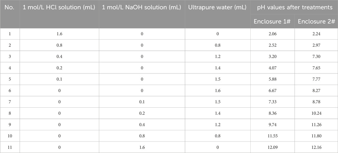 The sediment in enclosure 1# exhibited a slightly acidic with a pH of 6.67, whereas the sediment in enclosure 2# demonstrated an alkaline character with a pH of 8.27 (Table 1). The acid buffering capacity of the sediment in enclosure 2# was found to be superior to that in enclosure 1#, as evidenced by a smaller pH variation of the overlying water when a certain amount (≤0.4 mL) of 1 mol/L HCl was added.