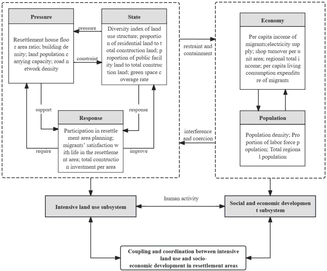 Our analysis reveals that the interaction between intensive land use and socioeconomic development in the resettlement area remains at a stage of primary coupling coordination. This imbalance primarily arises because land-use planning in reservoir-induced resettlement areas has not fully incorporated long-term development demands, particularly the quality of migrant life and the pursuit of sustainability (He et al., 2023). A deeper analysis reveals that this lag in the land system is not an isolated phenomenon, but rather a concentrated manifestation of the ruptures or delays occurring at multiple stages along the “Pressure–State–Response” (PSR) chain.