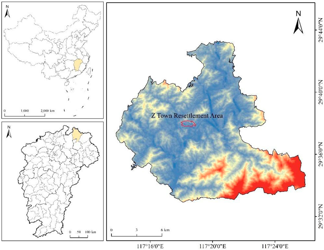 The site of the W Water Conservancy Hub Engineering Dam is located in Luotan town, Jingdezhen. The project mainly involves flood prevention but also has the functions of water supply and power generation. The project involves 31 migrant resettlement areas. Z Town is located in northeastern Fuliang County. The Z Town resettlement area is one of the largest, with the largest population, and is the only migrant resettlement area in the form of an urban collective town. In accordance with the relevant requirements of migration resettlement of the W Reservoir, migrants who require resettlement to Z Town are not involved in the deployment of productive land (paddy fields and dry land). Therefore, the Z Town resettlement area no longer has productive agricultural land. After migrants are relocated, they will not rely on land to maintain their living standards and will instead maintain their livelihood through other channels. Z Town Migration Source Construction is divided into residential construction and nonresidential housing construction. In summary, the Z Town resettlement area holds significant representativeness and research value in terms of scale, landv-use patterns, socioeconomic development trajectory, and urbanization processes. By selecting this area as our research focus, we aim to provide a unique and valuable case study that elucidates the intricate coupling between land intensification and socioeconomic development. The geographical location of the Z Town resettlement area is shown in Figure 2 below.