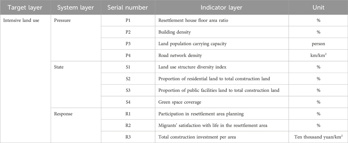 The pressure indicators are used to measure the pressure caused by intensive land use in the resettlement area, such as the resettlement housing floor area ratio, and building density, and includes a total of four indicators (Kexin et al., 2023). State indicators are used to measure the current status of and changes in land use, such as the land use structure diversity index and the proportion of residential land to total construction land, and include a total of four indicators (Cheng et al., 2022). Response indicators are used to measure the implementation status of relevant policies and measures, such as participation in resettlement area planning and migrants’ satisfaction with life in the resettlement area, and include a total of three indicators (Haoxuan, 2017). The specific indicators are shown in Table 1 below: