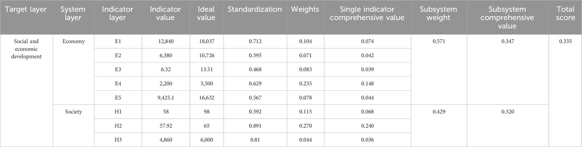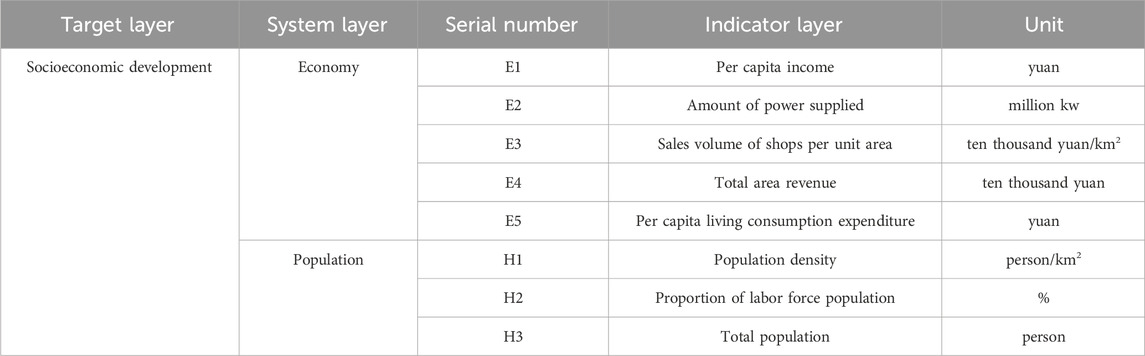 This study integrates the socioeconomic development characteristics of reservoir resettlement areas with the objective of accurately evaluating development levels across both economic and population dimensions (Deng and Song, 2025). The population subsystem serves as the foundation of socioeconomic development in resettlement areas, encompassing key demographic features such as population size, density, and structure. In contrast, the economic subsystem functions as the core driving force of development, reflecting not only the region’s overall strength in resource endowment and capital accumulation but also the livelihood quality and economic vitality of migrant communities (Li T. et al., 2024). These two subsystems are interrelated and mutually reinforcing, together constituting the essential dimensions for assessing socioeconomic development. Accordingly, this study constructs an indicator system for evaluating the socioeconomic development level of the W Reservoir resettlement area (Z Town), taking both economic and population subsystems into account (Bian et al., 2024).