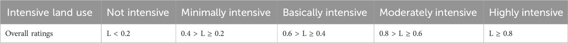 From a systemic perspective, land use represents a typical coupled “nature–society–economy” system (Zhang et al., 2005). Within this system, the concept of intensive land use has emerged as a strategic response to the scarcity of territorial space. It emphasizes maintaining a dynamic balance among population, resources, and the environment, as well as achieving synergy across economic, social, and ecological benefits. By controlling development intensity, optimizing spatial structures, and adjusting industrial layouts, intensive land use can drive regional industrial restructuring and promote the transformation of development models. From a supply-side perspective, intensive land use not only facilitates resource integration and factor reallocation but also supports regional green transformation and high-quality development (Jiang and Zhou, 2024).