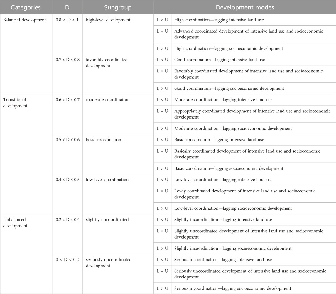 where D is the coupling coordination of the two systems. When D is higher, the degree of coupling coordination between subsystems is greater, indicating that intensive land use matches the level of socioeconomic development in the resettlement area. A lower value of D indicates uncoordinated development. According to previous research (Wang et al., 2023b), this article divides the coupling coordination index D, and the specific results are shown in Table 5.