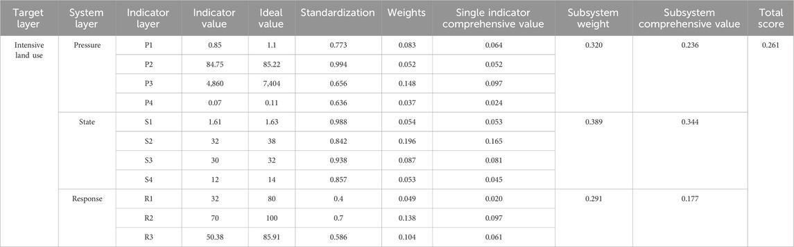 Therefore, this article combines the characteristics of the reservoir resettlement land and the special geographical factors of the town resettlement area, from the three levels of pressure, status and response, with the goal of accurately measuring the land use level in the resettlement area (Cheng et al., 2022). The PSR structure model was proposed by the Economic Cooperation and Development Organization (OECD) and the United Nations Environmental Planning Department (UNWP) as a data analysis model for use in evaluating the impact of human activities on the ecological environment and the socioeconomic activities that occur in response (Haoxuan, 2017). The PSR model includes three subsystems: P for pressure, S for state, and R for response. Today, the PSR model has become one of the most commonly adopted and scientific research methods in the field of land resource utilization (Yu et al., 2023; Pan H. H. et al., 2024).