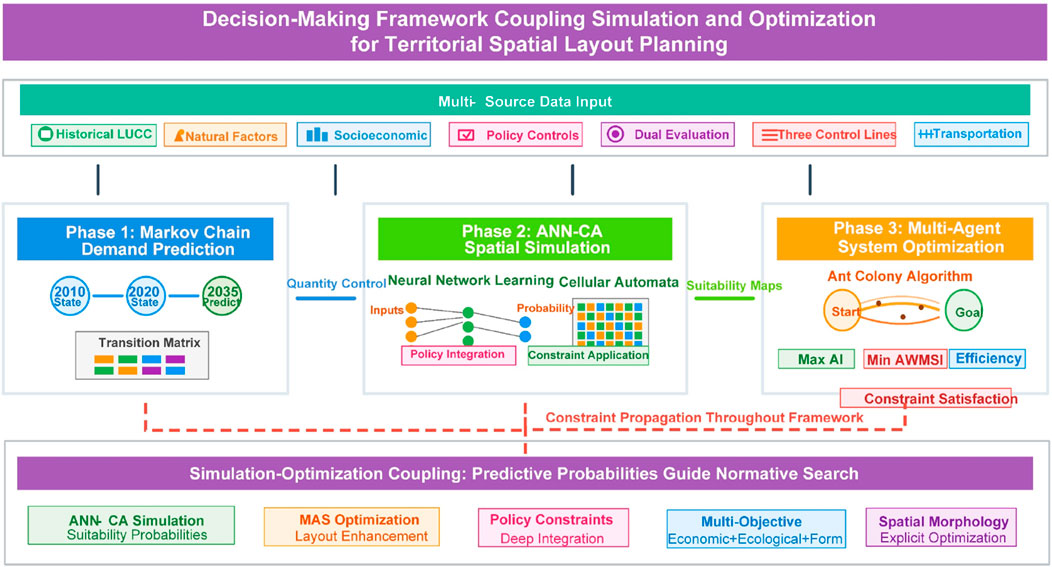 Introduction: The primary challenge in territorial spatial planning is optimizing land allocation under complex constraints. This study aims to bridge the gap between predictive simulation and normative optimization to support scientific planning.