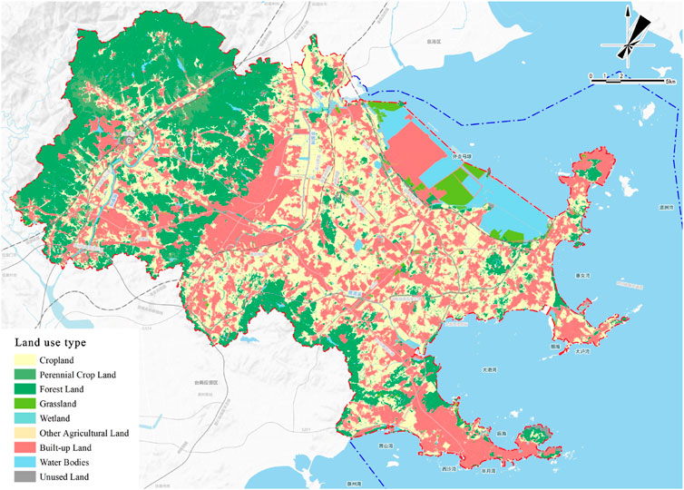 Hui’an County possesses “three mountains and five bays” natural ecological foundations but confronts typical contradictions between development demands and cropland protection and ecological conservation during rapid development processes. This complexity of development stages, resource endowments, and planning challenges makes Hui’an County an ideal and representative practical scenario for testing and applying the coupled simulation and optimization framework proposed in this research. The study area exhibits predominant land use patterns of agricultural land, forest land, and construction land as of 2020, with spatial distribution reflecting typical southeastern coastal development characteristics.