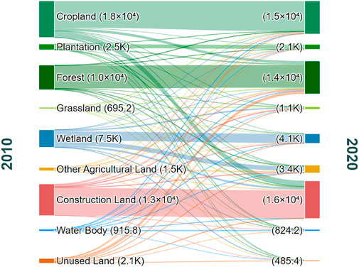 To ensure subsequent simulation and optimization realism and scientificity, this research initially extracted study area historical evolution patterns and predicted future land use demands. Analysis of 2010–2020 land use data revealed significant structural and spatial changes in the study region (Figure 5). Quantitatively, construction land represented the most remarkable expansion type, with total area increasing from 13,459.24 ha to 16,196.30 ha, achieving net increase of 2,737.06 ha over 10 years with relative growth of 20.3%. Contrasting sharply, cropland and wetland resources confronted severe loss pressures, with areas decreasing from 17,977.30 ha to 7,488.85 ha to 15,015.17 ha and 4,168.12 ha respectively, representing net reductions of 2,962.13 ha and 3,320.74 ha.