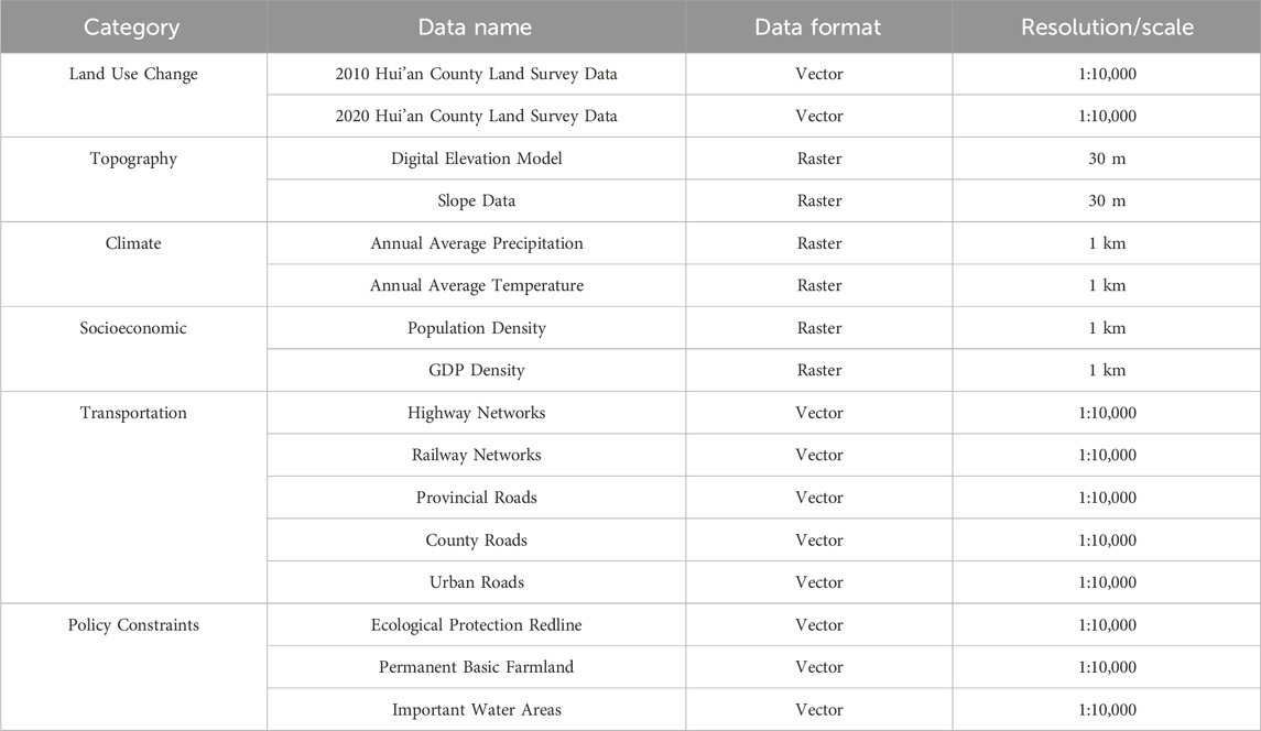 To support simulation and optimization model construction, multi-source spatial and attribute data covering Hui’an County’s entire territory were collected and processed (Table 1). Core land use data originated from official national land survey vector databases for 2010, 2015, and 2020 time points. To ensure analytical consistency, original land classifications were uniformly reclassified into 9 primary categories: cropland, plantation land, forest land, grassland, wetland, other agricultural land, construction land, water areas, and unused land, with all data converted to 10-m spatial resolution raster format.