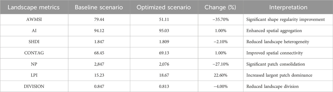 Results: The optimization yielded significant quantitative improvements compared to the baseline scenario. The spatial configuration of construction land became more regular, with the Area-Weighted Mean Shape Index (AWMSI) decreasing by 35.7% from 79.44 to 51.11. The layout also became more compact and less fragmented, evidenced by a 1.0% increase in the Aggregation Index (AI) to 95.03 and a 27.1% reduction in the number of patches.