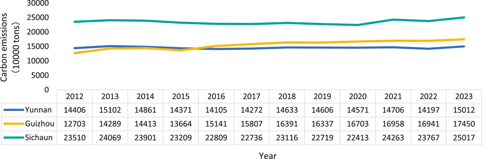 China has a vast territory, and there are significant differences in resource endowment, energy structure and economic conditions among provinces (Guan et al., 2024). The energy consumption and carbon emissions of urbanization and economic development show obvious regional characteristics according to different regions. Therefore, in the planning and implementation process of the “dual carbon” policy, it is not advisable to adopt a unified standard and generalized approach. It is extremely necessary to conduct in-depth analysis of carbon emissions in specific regions (Liu et al., 2025). The carbon emissions in Yunnan, Guizhou and Sichuan from 2012 to 2023 are shown in Figure 1.