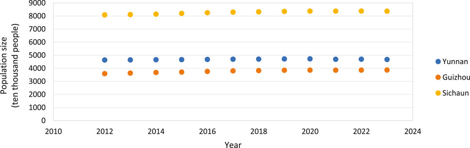 Figure 8. Population size of Yunnan, Guizhou and Sichuan in the period 2012–2023 (Data source: National Bureau of Statistics).