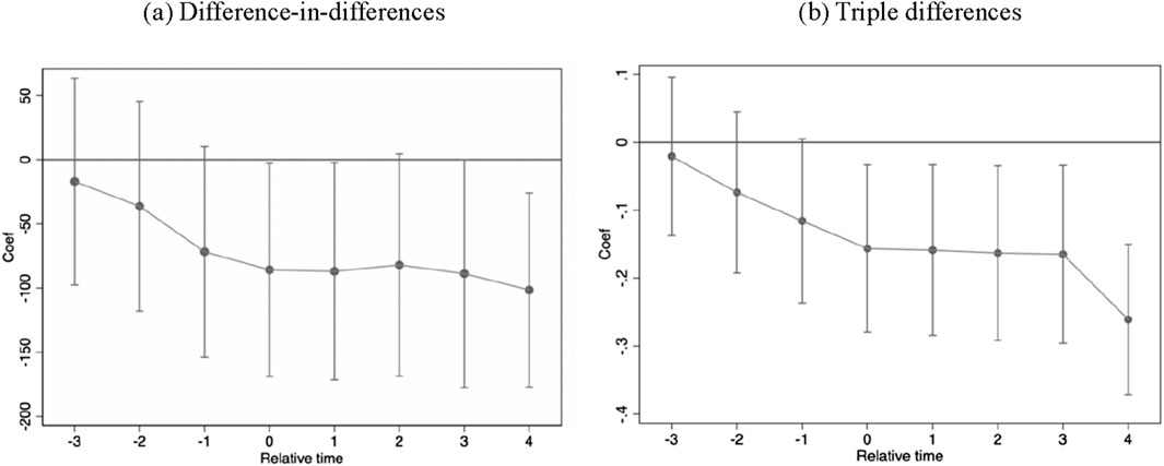 Before the implementation of the policy, the carbon emission trend of the samples of the experimental group and the control group should be a parallel trend, and whether the sample data satisfy the assumption of parallel trend is a prerequisite for guaranteeing that the estimation results of the above model have good precision and unbiased consistency. The test results of the difference-in-differences model and triple-differences model are shown in Figure 2. Figure 2a shows the results of the parallel trend test based on the carbon emissions trading policy. Before the implementation of the carbon emissions trading policy, the level of carbon emissions fluctuated around the value of 0, and the estimated coefficients were not significant at the significance level of 10%, which indicated that before the implementation of the policy, there was no significant difference between the carbon emissions of the treatment group and the control group, so the parallel trend test was passed. In the policy implementation period carbon emissions produce a significant effect, and with the increase in the time of policy implementation, in the fourth period carbon emissions appear to further decline.